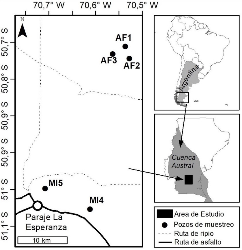Se analizaron cinco muestras de crudo de la Formación Magallanes de la Cuenca Austral, tomadas de distintos pozos del yacimiento Estancia Agua Fresca: AF1 (Lon. 70° 30’ 53,74” W Lat. -50° 44’ 41,30” S), AF2 (Lon. 70° 30’ 14,14” W Lat. -50° 46’ 1,58” S) y AF3 (Lon. 70° 33’ 5,14” W Lat. -50° 45’ 29,54” S), a 1400 m de profundidad. Las muestras de los pozos: MI4 (Lon. 70° 37’ 44,70” W Lat. -51° 2’ 20,72” S) y MI5 (Lon. 70° 45’ 22,77” W Lat. -50° 59’ 58,87” S) proceden del yacimiento María Inés, a 1700 m de profundidad. Los crudos fueron recolectados y transportados al laboratorio en botellas limpias de vidrio (un litro de capacidad color ámbar) para evitar la fotooxidación. En el llenado de las botellas se evitó la presencia de cámara de aire para minimizar el impacto del oxígeno en la estabilidad de las muestras y prevenir su biodegradación, éstas fueron almacenadas en lugares oscuros y secos a temperatura ambiente hasta la realización de los análisis dentro de las siguientes 72 h.