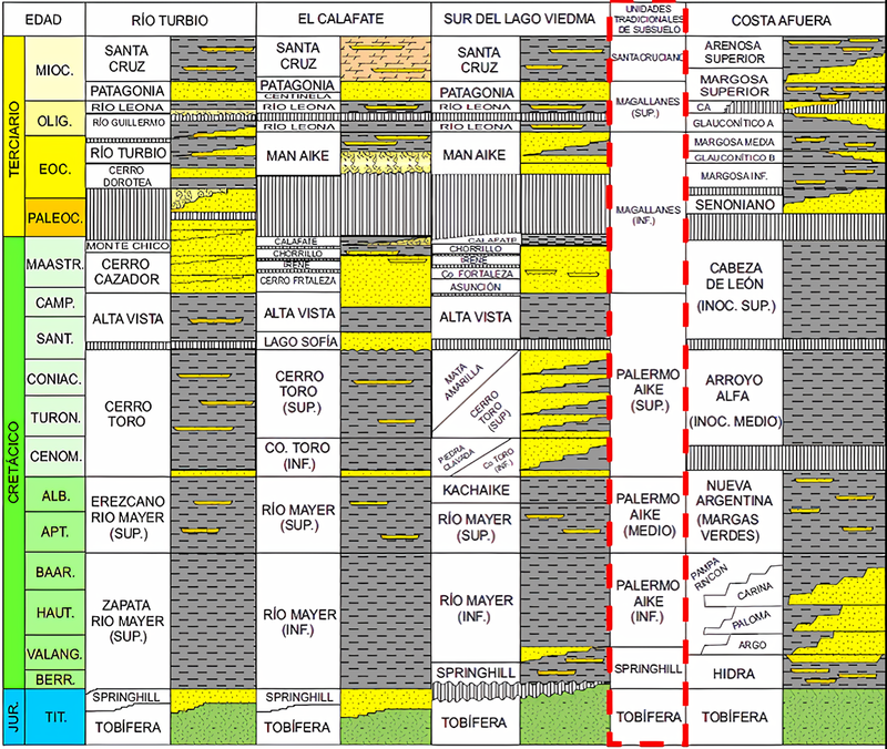 Después de la fase de ruptura en el Jurásico tardío se inició en la cuenca un ciclo tectónico transgresivo caracterizado con la depositación de la Formación Inoceramus Inferior compuesta de lutitas ricas en materia orgánica (Gallardo, 2014). La fase de hundimiento continuó durante el Cretácico medio con la depositación de la Formación Margas Verdes, representada por lutitas calcáreas y argilitas marinas, señalando el inicio de un nuevo ciclo tectónico. La Formación Margas Verdes está cubierta por lutitas y areniscas muy finas de la Formación de Palermo Aike, depositadas en facies turbidíticas durante el Cretácico tardío, con el inicio de una cuenca occidental (Richiano et al., 2016). Las areniscas típicas de la cuenca están representadas por dos unidades terciarias. El Magallanes Inferior (Paleoceno-Eoceno) descansa de manera inconforme sobre el Cretácico y está compuesto por areniscas glauconíticas y de cuarzo, y lutitas, depositadas en un entorno marino (Mpodozis et al., 2011). El Magallanes Superior (Eoceno tardío - Mioceno temprano) está compuesto por conglomerados, areniscas, lutitas y lechos de lignito. La unidad fue depositada en un entorno fluvial a marginal marino (Barberón et al., 2015). La formación del Mioceno suprayacente está representada por depósitos continentales de la Formación Santa Cruz. En la Figura 2 se observa un diagrama estratigráfico de la Cuenca Austral para diferentes localidades de la misma en el cual se observan las unidades tradicionales del subsuelo.