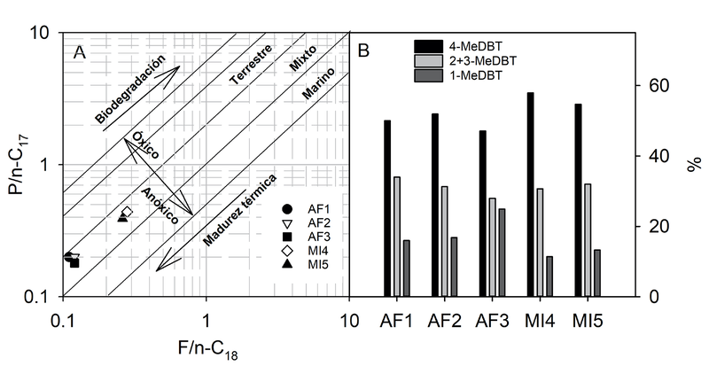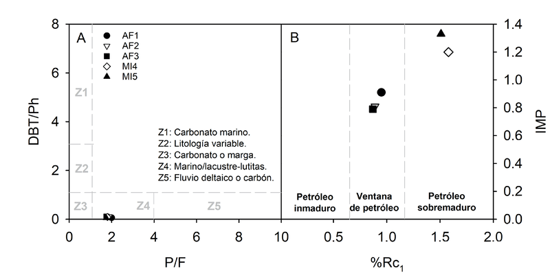La relación dibenzotiofeno/fenantreno (DBT/ Ph) en función de pristano/fitano (P/F), es usada como indicador de ambiente depositacional de rocas sedimentarias (Hughes et al., 1995). Las muestras estudiadas se ubicaron dentro de la zona cuatro en el diagrama de la Figura 5A, sugiriendo que las condiciones de sedimentación se asociaron a un paleoambiente marino, depositadas en condiciones de reducción moderada dado por valores de P/F en torno a 2.0. En un estudio llevado a cabo sobre crudos extraídos del yacimiento Del Mosquito pertenecientes a la Formación Springhill de la Cuenca Austral (Tomas et al., 2020) se obtuvieron resultados semejantes que se asocian a condiciones de depositación marinas y subóxicas. Es probable que los crudos almacenados en las unidades estratigráficas Magallanes y Springhill puedan provenir de unidades generadoras de petróleo con características semejantes. Volviendo al trabajo en discusión, los isómeros 1, 2 + 3 y 4-Metildibenzotiofeno (MeDBT) aportan información sobre la litología de la roca madre (Killops y Killops, 2005). El patrón tipo escalera de los porcentajes relativos de estos isómeros del MeDBT permitió proponer que la naturaleza de la roca generadora es siliciclástica (Figura 4B). Esto se correlaciona con la bibliografía referida a la Formación Margas Verdes (Mpodozis et al., 2011; Ramos et al., 2019), la cual se describe como una roca fuente constituida por lutitas calcáreas y argilitas marinas.