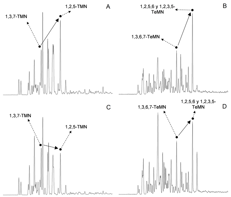 Por cada muestra de crudo se inyectó en un cromatógrafo de gases un µl de los extractos alifáticos y aromáticos en modo Splitless. La separación cromatográfica se realizó en un cromatógrafo de gases Agilent modelo 7890A, con un detector de espectrometría de masas de la misma marca (modelo 5975C). Se utilizó una columna HP5ms de 30 m de largo, con un diámetro interno de 0.32 mm y un espesor de película de 0.25 µm. La temperatura del inyector se ajustó a 290°C y se utilizó helio como gas acarreador con una velocidad de flujo de 1.2 ml.min-1. El programa de temperatura utilizado fue el siguiente: temperatura inicial de 55°C durante 2 min, seguido de una rampa de 6°C.min-1 hasta alcanzar los 270°C, pasando directamente a otra rampa de 3°C.min-1 hasta alcanzar 300°C, temperatura que se mantuvo durante 17 min. El tiempo total de corrida fue de 65 min. El detector de masas se utilizó con una temperatura de la fuente de iones y de la línea de transferencia de 230°C y 180°C respectivamente y una energía de impacto de 70 eV. El escaneo de masas entre 30 y 400 uma se realizó para obtener el cromatograma de iones totales (TIC) con el fin de determinar los isoprenoides acíclicos pristano y fitano y además se utilizó el ion m/z = 99 para analizar la distribución de n-parafinas en las fracciones de hidrocarburos saturados de los crudos. Por su parte, el modo SIM Scan (monitoreo de iones seleccionados) se usó para analizar los iones m/z = 170 (trimetilnaftalenos), 178 (fenantreno), 184 (dibenzotiofeno y tetrametilnaftalenos), 192 (metilfenantrenos) y 198 (metildibenzotiofenos y pentametilfenantrenos) en las fracciones aromáticas, y los iones m/z = 191 (terpanos) y 217 (esteranos) en los extractos alifáticos (Stashenko et al., 2014; Tomas et al., 2020).