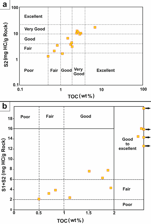 The amount of total organic carbon (TOC) of about 79% of the studied samples of the Pabdeh Formation in the present study (Northern Dezful Embayment) is above 1% (mean 2.24%). This TOC amount is similar to source rocks with medium to very good hydrocarbon potential (Peters, 1986; Peters and Cassa, 1994; Demirel, 2014; Hatampour et al., 2014). Alizadeh et al. (2012) showed that the average of TOC in the Pabdeh Formation samples of southern Dezful embayment was 1.62%, which indicates higher TOC in the northern fields. High TOC values and low S1 content in the studied samples indicate that the hydrocarbons are autochthonous (Figure 3) and also indicate the absence of contamination for the studied samples (Hunt, 1996). Given that obtaining accurate hydrocarbon potential based on TOC data alone is not very reliable, S1 and S2 values obtained from Rock-Eval pyrolysis are used to confirm the hydrocarbon potential interpretation (Peters and Cassa, 1994). According to RockEval pyrolysis results (Table 1), S1 and S2 values confirm that the Pabdeh Formation has hydrocarbon potential ranging from poor to very good. The TOC versus S2 diagram (Peters and Cassa, 1994) shows moderate to very good hydrocarbon potential for the analyzed samples (Figure 4a). The genetic potential of the studied samples (S1 + S2) varies from 1.96 to 21.72 mg HC/g rock. At the same time, the S1+S2 versus TOC diagram also confirms the medium to excellent hydrocarbon potential for the analyzed samples of the North Dezful oil fields (Figure 4b).