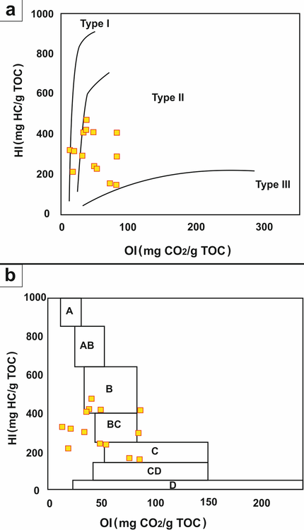 Hydrogen Index and Oxygen Index values indicate that the Pabdeh Formation samples were deposited in mixed terrestrial and marine environments with high to intermediate sedimentation rates and suboxic conditions. HI against Tmax shows that the studied sediments contain type II kerogens and generally plot in an immature to the early mature zone.
