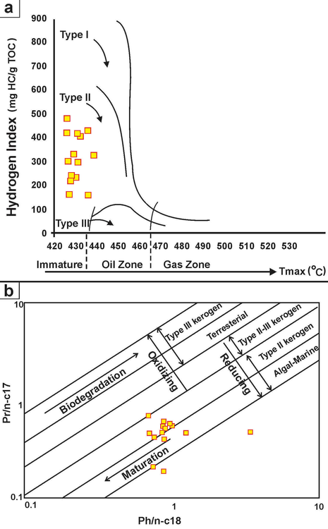 By plotting the data of the studied samples, these samples are generally plotted in the immature to early mature field and type II kerogen (Figure 6a), which confirms the data of the previous plots.