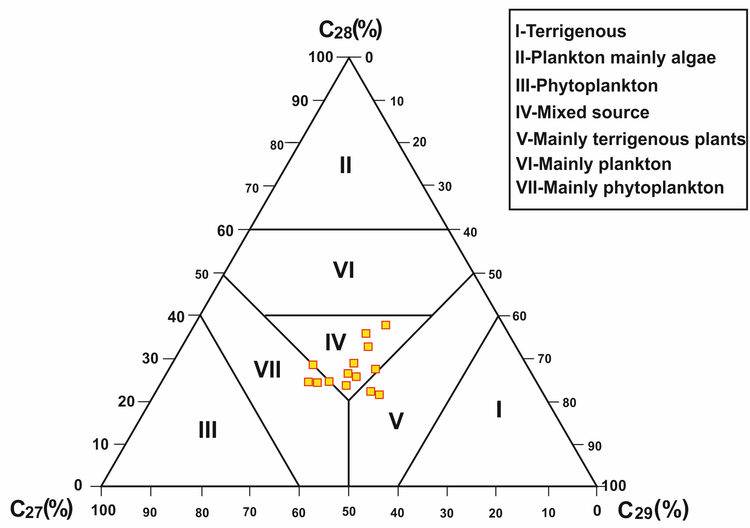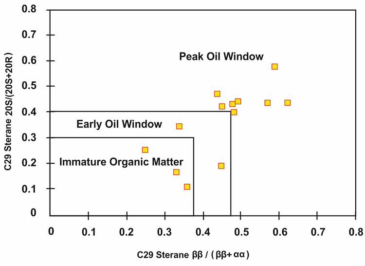 The type of organic matter source of analyzed sediments can be obtained based on the relative abundance of regular steranes (C27, C28, and C29) (Peters et al., 2005) using a triangular diagram (Figure 7). This plot shows that most of the analyzed samples have mixed origin of organic matter (58%), and a limited number is in the range of terrestrial plants (14%), and also a small number is in the phytoplankton origin range (28%), which is consistent with B, BC and C fields of Jones (1987), identified from pyrolysis data. The plot of C29 steranes the 20S/(20S+20R) versus ββ/(ββ + αα) is one of the diagrams commonly used to determine the thermal maturity of organic matter because C29 steranes increase with increasing thermal maturity (Peters and Moldowan, 1993; Peters et al., 2005). The values of these two C29 steranes for the studied samples are presented in Table 2. The 20S/(20S+20R) C29 sterane isomerization in the analyzed samples varies from 0.11 to 0.62 and ββ/ (ββ+αα) C29 sterane isomerization ranges from 0.25 to 0.62. Based on this plot (Figure 8), most of the analyzed samples are located at the peak of the oil window, two are plotted in the early oil window range, and three are in the immature organic matter field. These three samples are related to Dehluran, Paydar West, and Zeloi oil fields, in the northern sections of the North Dezful Embayment, and have small amounts of organic matter. The difference between the results of this diagram and HI versus Tmax diagram shows that pyrolysis data alone is not enough to examine maturity and biomarker data should also be used.
