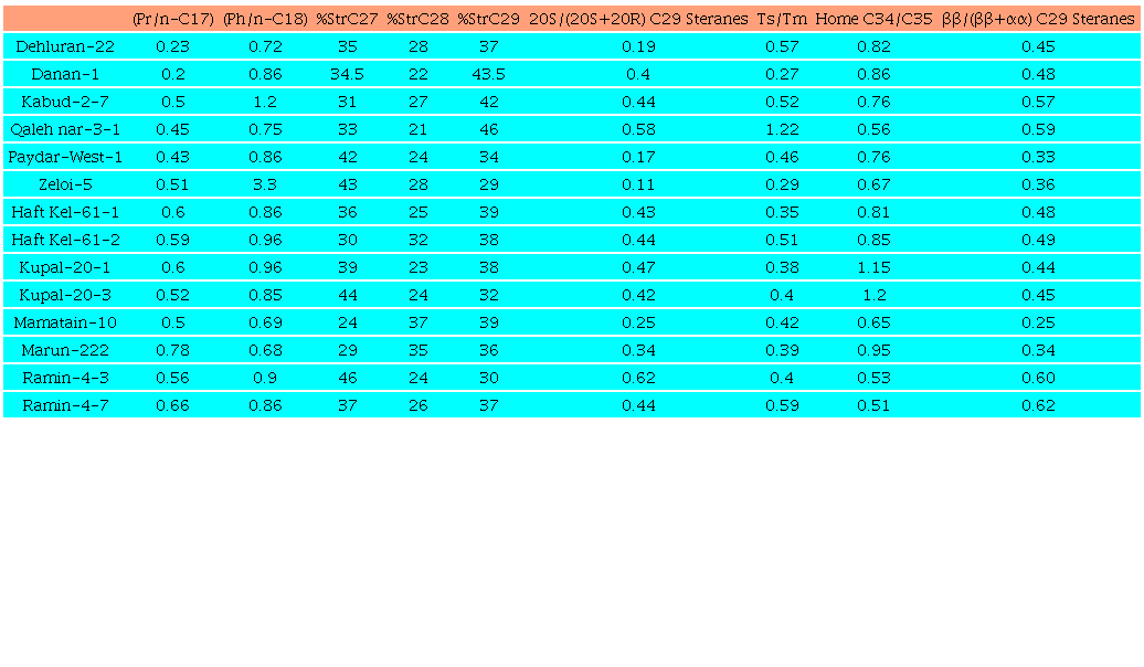 Various parameters of terpenes such as Ts/Tm, C29/C30, and C34/C35 ratios obtained from m/z 191 ion chromatograms are used to separate the depositional settings of sediments containing organic matter (Van Graas, 1990). Accordingly, Ts/Tm and C34/C35 ratios have been used to investigate and determine the sedimentary environment of the samples in this study. Hunt (1996) has shown that the Ts/Tm ratio increases with increasing shale in calcareous facies. Ts/Tm ratios begin to decrease quite late during maturation (Van Graas, 1990). Table 2 shows that this ratio often varies from 0.27 to 0.59 in the studied samples except for one in the Qaleh Nar oil field, where this ratio is 1.22. These values indicate that the samples studied were probably formed in calcareous facies. The C34/C35 ratio less than one indicates relatively reducing marine environments (Mello et al., 1988). Considering the values of this ratio in the studied samples (Table 2), it can be concluded that all samples were formed in a reduced environment.