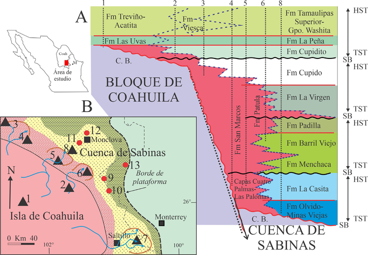 En la Cuenca de Sabinas las facies marginales para el Cretácico Inferior están representadas por sedimentos detríticos, como el Conglomerado Esmeralda en sierra Mojada; las capas Colorado y la Formación San Marcos en la sierra La Fragua; cima de las Capas Tanque Cuatro Palmas y la Formación San Marcos en el valle y la sierra de San Marcos-Pinos, así como las formaciones Barril Viejo y Patula en la sierra La Gavia. En la cuenca del Centro de México estas facies marginales están representadas por la Formación Carbonera, expuesta en las sierras de Arteaga, Parras y Puerto Los Soldados, Coahuila (Eguiluz, 1989). Como depósito de carbonatos en el margen del Bloque de Coahuila se encuentran las formaciones Cupido - Cupidito. Así mismo, durante el Albiano y Cenomaniano Temprano entre las entidades paleogeográficas referidas, se presentan evidencias del paso de una plataforma, circunscrita por parches de arrecife (Formación Viesca), hacia facies de cuenca (Garza, 1973). Los contrastes litológicos son notables entre una sedimentación marina que se depositó tempranamente en las cuencas, versus una sedimentación marina depositada tardíamente sobre el Bloque de Coahuila, vinculados con la presencia de una cuña siliciclástica entre ambos dominios sedimentarios, con facies continentales que gradúan y se interdigitan con facies marinas. Estos cambios litológicos son la base para sustentar la presencia del borde paleogeográfico entre la cuenca y un continente emergido en el Jurásico Superior y el Cretácico Inferior, pero este continente desapareció al ser cubierto por el mar en el Bedouliano Tardío (Figura 1).