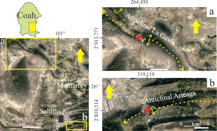 Este trabajo presenta datos adicionales de fallas que sustentan extensión tectónica simultánea al depósito de sedimentos de las formaciones Carbonera y Arcosa Patula, en el margen que circunda al Bloque de Coahuila, durante el Cretácico Inferior, en afloramientos de las sierras de La Gavia y Arteaga, Estado de Coahuila (Figura 2).