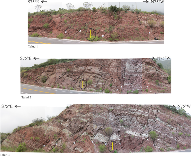 Se identificó que existen, en varios casos, estratos contínuos que no muestran desplazamiento vertical por falla, por lo que se interpreta que esta característica puede ser un argumento para considerar que las fallas ocurrieron durante un proceso contemporáneo al depósito de la Arcosa Patula (Figura 3). En los estratos que sirven de referencia para distinguir el movimiento relativo separado por las fallas no se identifica cambio de espesor entre el bloque de piso y techo, por lo tanto, no se ven como estratos de crecimiento para sospechar un desplazamiento gradual, sino por el contrario, su aspecto sugiere conjunto de bloques deslizados. Aunado a esto, hay presencia de material triturado (brecha a microbrecha) en varios núcleos de las fallas. Los datos que se obtuvieron para los cortes seccionados de la carretera se muestran proyectados en redes de Schmidt en la Figura 5. Un grupo predominante de planos de fallas están orientados sensiblemente NNE-SSW en el talud 3 (Figura 5E y Tabla 2), el ángulo del echado de falla es cercano a 45° al ESE, mientras que un grupo limitado de fallas están orientadas NNW-SSE e inclinan al ENE en este mismo grupo de fallas (Figura 5E).