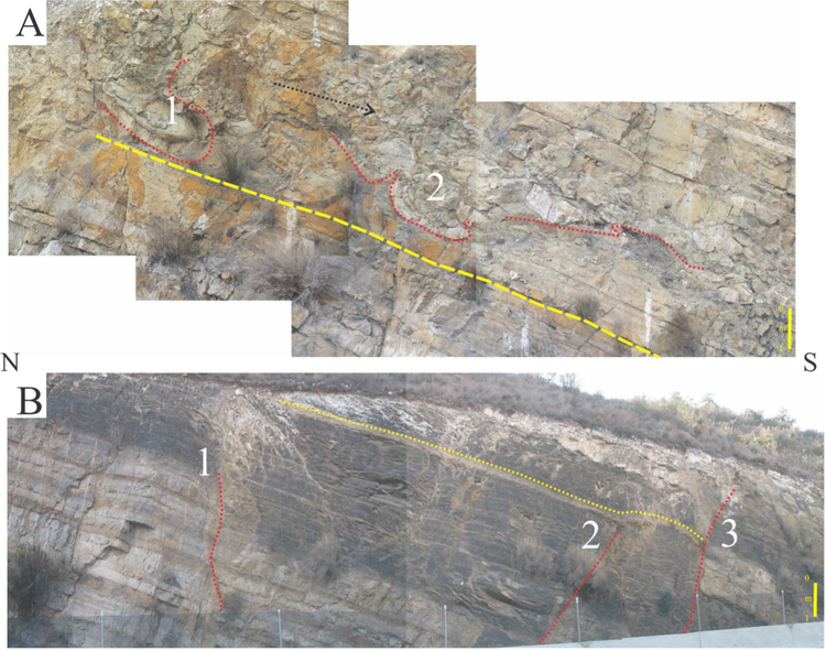 Esta localidad se ubica en el kilómetro 231.5 de la carretera federal 57D, coordenadas UTM 319,119 m E y 2´810,514 m N (Datum WGS84). El corte expone tres fallas de tipo normal, dispuestas en el flanco sur del anticlinal Arteaga o también conocido como Los Chorros (Padilla y Sánchez, 1982), con su eje orientado 12°/253° y con transporte al NNW (Rodríguez-Gómez, 2020; Figura 2). Esta estructura, paleogeográficamente, se ubica en el borde de la Cuenca del Centro de México, en el sector occidental de la Saliente de Monterrey. La litología en este afloramiento corresponde a la Formación Carbonera (Eguiluz, 1989), compuesta por arcosa en capas de 30 a 60 cm de espesor, interestratificada con capas de limolita y lutita de espesor mediano a grueso, con estratos de conglomerado con superficies de corte y relleno, varios estratos tienen geometría de cuña con terminación sobre estratos inferiores (onlap). Se presentan cuerpos métricos con estratos de pliegues contorsionados (slump), así como socavación erosiva o canalización (Figura 4A). Esta facies se interpretó como propia de frente de un delta (Eguiluz y Aranda, 1984). En esta localidad la Formación Carbonera yace sobre la Formación La Casita, con litología particularmente distinta, diferente edad (Kimmeridgiano-Tithoniano) y subyace a facies lagunares con fósiles bentónicos de la Formación Cupido-Cupidito. El intervalo estratigráfico en donde están las fallas y estructuras sedimentarias de interés de este trabajo subyace a capas que contienen los fósiles Olcostephanus sp., Thurmaniceras sp. y Tinthinopsella sp., que se asignan al Valanginiano-Hauteriviano Temprano. En el afloramiento las tres fallas delimitan bloques altos y bajos escalonados (Figura 4B), se reconocen por la discontinuidad lateral de estratos de arenisca de color amarillo claro y lutita negra que sirven de niveles de referencia, pero también hay estratos delgados de arenisca en la cima de una falla que tiene continuidad lateral y no están afectados por rompimiento vertical de la falla. Estas fallas tienen planos inclinados en dirección opuesta, el rumbo de los planos es: 102°/87°, 312°/50° y 320°/50°, los cuales delimitan un bloque hundido de ~25 m de longitud. El rumbo de los planos de estratificación (So) presenta pequeñas variaciones, pero en promedio se dirigen 120°/20°. La cima del intervalo estructural descrito está separada por un espesor de 15 m en el que hay un nivel estratigráfico con estructuras contorsionadas (slump), con ejes orientados ~5°/320° y ~5°/340°, con vergencia al sursuroeste, los flancos y crestas se identifican como pliegues anisópacos con discontinuidad lateral y se reconoce socavación en un estrato inferior no deformado (Figura 4A). Los pliegues contorsionados están limitados arriba y abajo por estratos continuos lateralmente y paralelos entre sí, con cuñas, pero no comparten la deformación contorsionada.