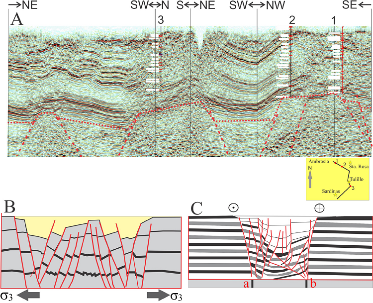 Secciones sísmicas 2D y 3D en la Cuenca de Sabinas muestran que el basamento tiene mayor afinidad con cuencas tipo rift, que analogía con los sistemas pull-apart (Figura 7A y 7B); sus bordes presentan márgenes abruptos con basamento escalonado hacia el interior de la cuenca, tienen acomodo burdamente dominó, con altos (horst) en su porción axial (vr. gr. campo Monclova e isla de La Mula), bloques ligados con rampas enlazadas a zonas de transferencia en acomodo oblicuo a la dirección de extensión original del rift y cuñas sedimentarias en los bordes (Figura 7C). Las secciones sísmicas no muestran estructuras en echelón que pudieran sugerir desplazamiento lateral en el borde SE de la Cuenca de Sabinas. La carpeta sedimentaria deformada en el Paleógeno muestra pliegues tipo drape fold en los bordes de la Cuenca de Sabinas, éstos sugieren la reactivación de fallas de basamento, como así lo revelan los pozos y secciones sísmicas en el campo de gas Monclova (Eguiluz, 2001); esta observación puede extrapolarse para interpretar las estructuras de las sierras San Marcos, La Fragua, La Madera (Chávez-Cabello, 2005; Chávez-Cabello et al., 2005, 2007; Alonso-Manuel et al., 2020) y posiblemente La Gavia, entre otras. La paleolatitud de estas rocas en el Cretácico Inferior no indica rotaciones mayores y su posición es congruente con la esperada para esta paleo-latitud (Arvizu-Gutiérrez, 2006).