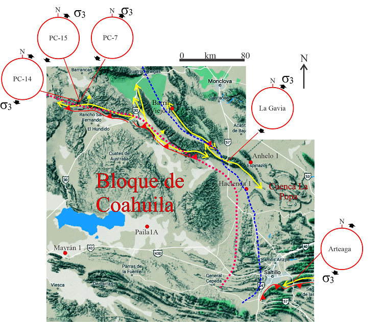 Las características estructurales que aquí se describen, aunadas a datos similares en otras localidades (Chávez-Cabello et al., 2005), muestran que durante el depósito sedimentario del Cretácico Inferior existieron condiciones de inestabilidad para generar fallas en régimen de extensión y deformación de sedimento blando, que se dirigen hacia el interior de las cuencas que bordearon al Bloque de Coahuila (Figuras 1-5). En Potrero Colorado y en Valle de San Marcos (Chávez-Cabello et al., 2005) las fallas normales son sub-verticales, la dirección de extensión o del esfuerzo principal mínimo σ3 para rocas del Cretácico varía de 18°- 35°, sin discriminar la rotación ocasionada por acortamiento Paleógeno. En la sierra la Gavia acorde a este trabajo σ3 promedia un vector orientado ~191°-193° (Figura 5D, 5H y 8) y en el anticlinal Arteaga σ3 se orienta ~200°, en estas últimas localidades restituidas a una posible posición pre-acortamiento Paleógeno (Figura 5I), pero hay que considerar que las localidades citadas tienen transporte tectónico variable, generado en el Paleógeno, cuya reconstrucción palinspática está fuera de los alcances de este trabajo.
