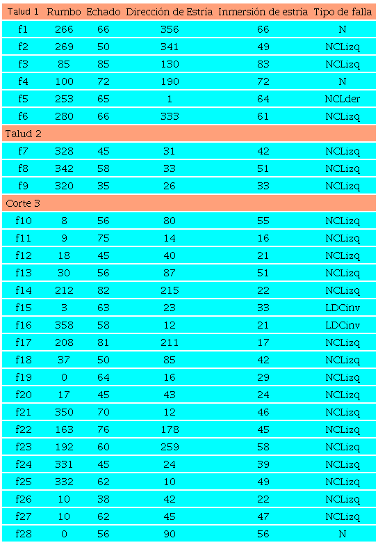 En tres cortes del talud se exponen afloramientos de estratos de la Arcosa Patula que están escalonados, segmentados por planos de fallas sub-verticales oblicuos al corte carretero. En la localidad de interés, el rumbo y echado de las capas sedimentarias (So) se documentó en cuatro sitios o taludes. En el sitio 1 el valor promedio de So fue de 111°/39°, sitio 2: 112°/42°, sitio 3: 170°/47° y sitio 4: 120°/47°. La variación importante en So correspondió al talud con mayor abundancia de fallas alcanzando una diferencia de rumbo de ~58° (Figura 5B). Las fallas documentadas en campo cortan y separan verticalmente a estratos que sirven de referencia para identificar al bloque de piso del bloque de pared colgante, con saltos que varían desde decimétricos a métricos (Figura 3). De un total de 28 fallas medidas (Tabla 2), la mayoría (22 fallas) son con cinemática normal y componente lateral izquierda definiendo una geometría de tipo dominó. Existen tres fallas normales con desplazamiento puro en dirección del buzamiento y corresponden a las fallas 1, 4 y 28. Se identificaron dos fallas laterales derechas con componente inversa (fallas 15 y 16: Tabla 2). Finalmente, solo se documentó una falla normal con componente lateral derecha (falla 5: Tabla 2). Algunas fallas se observan con su plano de falla cóncavo hacia arriba y lateralmente tiende su base a ser horizontal para clasificarse de tipo lístrico. En todas las fallas se observaron estrías sub-horizontales sobre el plano de corrimiento. Aunque se reconoce que la mayoría de estas fallas cortan los estratos superiores, existen algunos casos donde esto no se aprecia (Figura 3, talud 2). No se identifica crecimiento de estrato sedimentario entre los estratos del bloque de piso, respecto a los estratos del bloque de techo separados por las fallas. Entre los planos de algunas fallas hay material de brecha de la misma formación parcialmente cementado, con partículas angulosas de tamaño variable de 2 a 5 cm y algunos planos con vetillas delgadas de cuarzo. En el talud 3 hay tres planos con estrias sub-horizontales en costra de sílice, identificadas con movimiento lateral izquierdo.