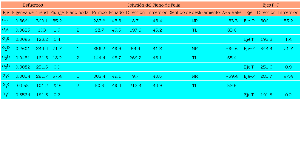 Mediante observaciones de campo en este trabajo se identificó un sistema de fallas que disloca estratos que están comprendidos en rocas que se depositaron entre el Berriasiano y Aptiano. Se obtuvieron datos de tres afloramientos del flanco sur del anticlinal de La Gavia y uno en el cañón Los Chorros de la sierra Arteaga. Con brújula Brunton se realizaron mediciones estructurales para obtener la orientación azimutal y la inclinación de los planos de las fallas (Tabla 2), pitch de estrías presentes, cinemática de las fallas, así como el rumbo e inclinación de los planos de estratificación. Los datos están indicados en convención “rumbo/ buzamiento” de planos en regla de la mano derecha. Empleando los programas STEREONET y FAULTKIN V 8.1.2 (Allmendinger et al., 2012; Cardozo y Allmendinger, 2013), los datos estructurales obtenidos en campo se representaron en el hemisferio inferior de la red estereográfica de Schmidt (igual área), lo que permitió visualizar el arreglo actual de las fallas y las direcciones principales de los planos de estratificación. Los datos estructurales fueron graficados y, según el caso, posteriormente se realizaron rotaciones en el eje vertical, lo anterior, para realizar restituciones de datos afectados por procesos posteriores a la generación de las fallas normales. Los datos de entrada fueron rumbos y echados de las capas (So) para rotar datos hacia una posición estructural congruente con el flanco sur del anticlinal La Gavia. La comparación de ambas representaciones gráficas (con rotación y sin rotación), permitió visualizar la actitud de planos, polos y direcciones de tensores de esfuerzos generados a partir de datos de fallas, antes y después de su rotación por procesos posteriores a la generación de las fallas como traslado de bloques hacia el interior de la cuenca.