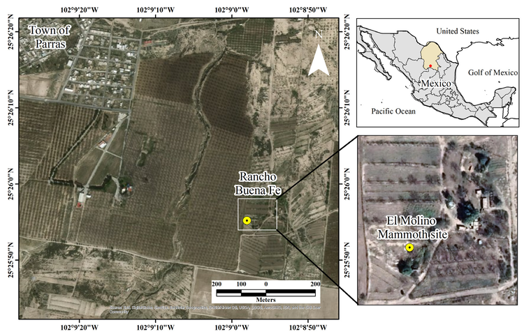 Because of the collapsed basal part of the geological strata, Late Pleistocene sediments could not be sampled for this study. However, we used the sediments remaining from the mammoth excavation in 2000, which were stored at the laboratory of Paleontology of the Museo del Desierto in Saltillo, Coahuila, Mexico.