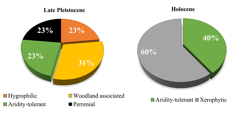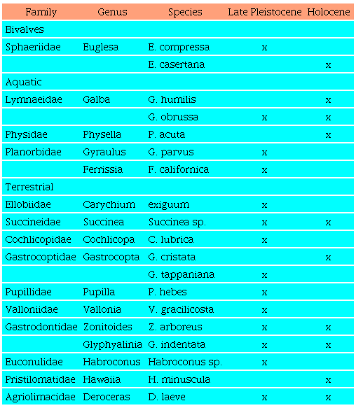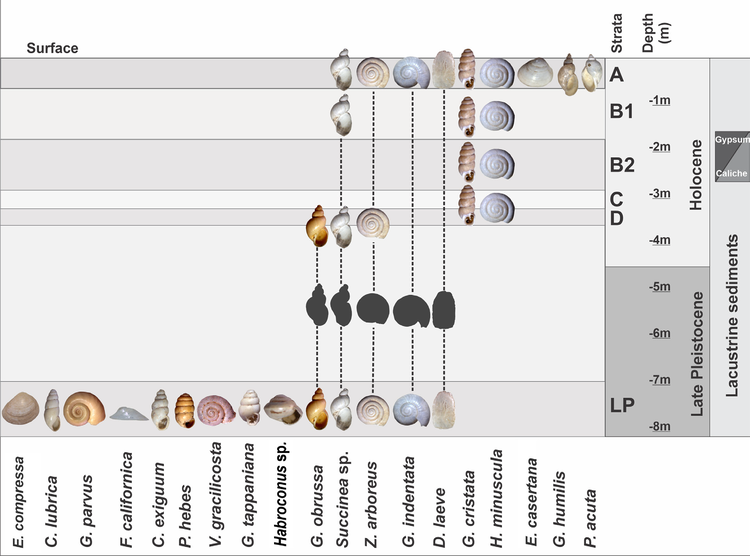 The early mid-Holocene was probably warmer and wetter than today, and true desert conditions did not set in until about 4000 yr B.P. (Metcalf et al., 2000). It is likely that the B horizon with its gypsum and calcium carbonate crystals represent these desert condition with dry climates and periods of evaporation and drought, and would likely explain the rapid colonization of the xerophytic elements in the profile that overall represent 60% of the malacofauna during this period (Figure 6). During the final phase of the body of water, there was an increase in the aquatic species P. acuta and G. humilis, accompanied by the aridity tolerant freshwater bivalve E. casertana. Agenbroad and Mead (1994) point to the abundance of Physella as indicative of warm waters. On the other hand, G. humilis is an excellent colonizer of new habitats and known for invading ponds devoid of vegetation and other species of gastropods (Jokinen, 2005). The ten species of the malacofauna that survived the transition into the Holocene are known for their tolerance of high temperatures (Miller, 1966). During this time, the site consisted of an ephemeral pond with predominant vegetation consisting mainly of short grasses and shrubs.