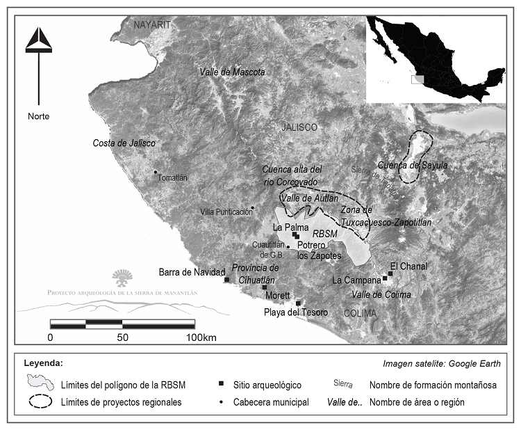 La RBSM se integra al área arqueológica conocida como “Occidente de Mesoamérica”, la cual está constituida por numerosas regiones con problemáticas culturales específicas (Cabrero, 1985; Schöndube, 1994; Williams 1996). La década de los años 1940 marca los inicios de la investigación arqueológica en esta área, con la IV Mesa Redonda de la Sociedad Mexicana de Antropología (SMA) en 1948 y, en particular, para la arqueología del sur de Jalisco con las publicaciones de Isabel Kelly (1945, 1948, 1949).