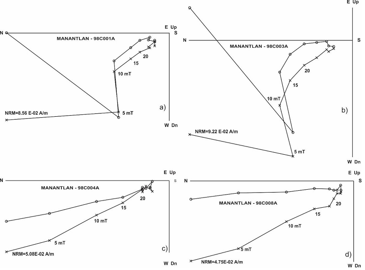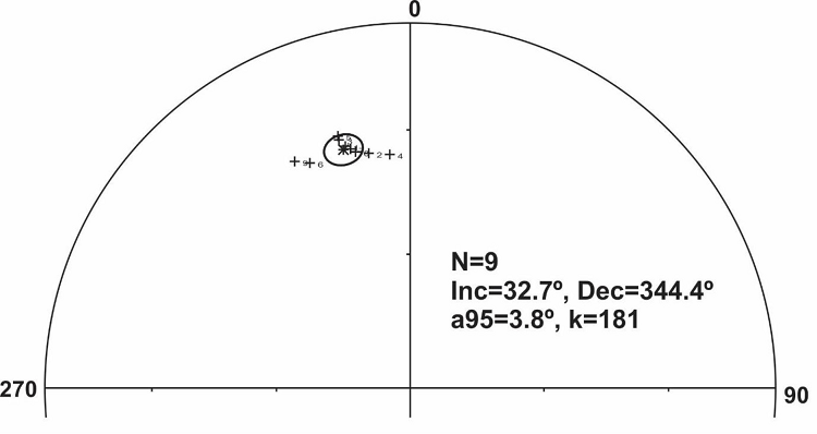 Aunque 17 especímenes fueron desmagnetizados mediante campos alternos, solo 9 de ellos mostraron una agrupación aceptable y, por lo tanto, fueron considerados para el cálculo de paleodireciones medias con el siguiente resultado: Inclinación=32.7º, Declinación=344.4º, α95=3.8º y k=181 (Figura 10). Los especímenes excluidos provienen mayoritariamente de una capa superficial de primeros 2 cm.