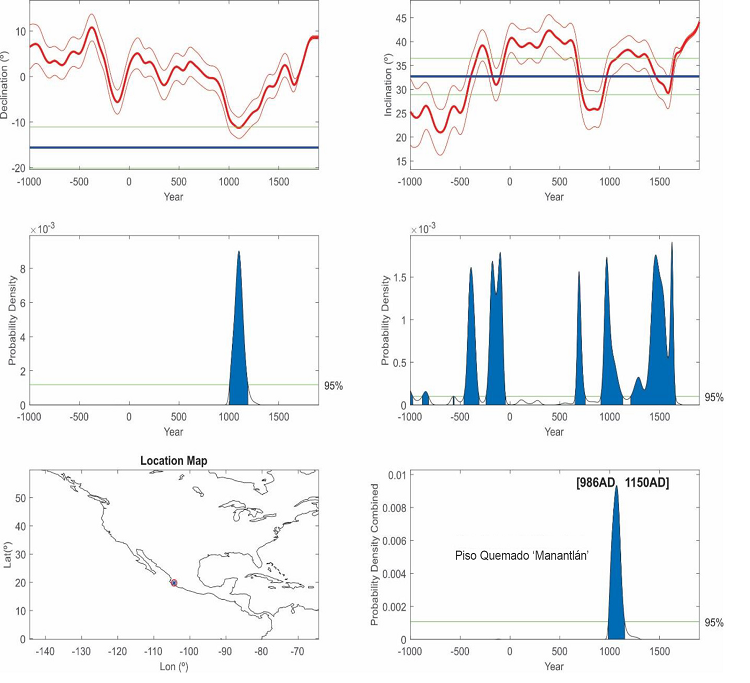 De acuerdo con la función de densidad de probabilidad combinada (considerando las funciones de densidad de probabilidad de la declinación y de la inclinación), el último evento de exposición al fuego del piso de Manantlán se estima entre 986 y 1150 d.C (Figura 11).