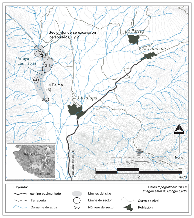 Para indagar en la caracterización crono-cultural y arquitectónica de los asentamientos del valle de Cuzalapa, el sitio de La Palma (con el número de registro 3) destacó por su estado de conservación, en comparación con los demás sitios de arquitectura prehispánica, en su gran mayoría destruidos por actividades y maquinaria agrícola. Para los habitantes del valle, el lugar llamado “La Palma” abarca una amplia zona ubicada hacia el noreste de la comunidad de Cuzalapa, por lo que el sitio se divide en cinco sectores (Numerados 3-1, 3-2, 3-3, 3-4 y 3-5) dispersos sobre un área 2.5 km2 a lo largo del arroyo Las Tablas (Figura 2).
