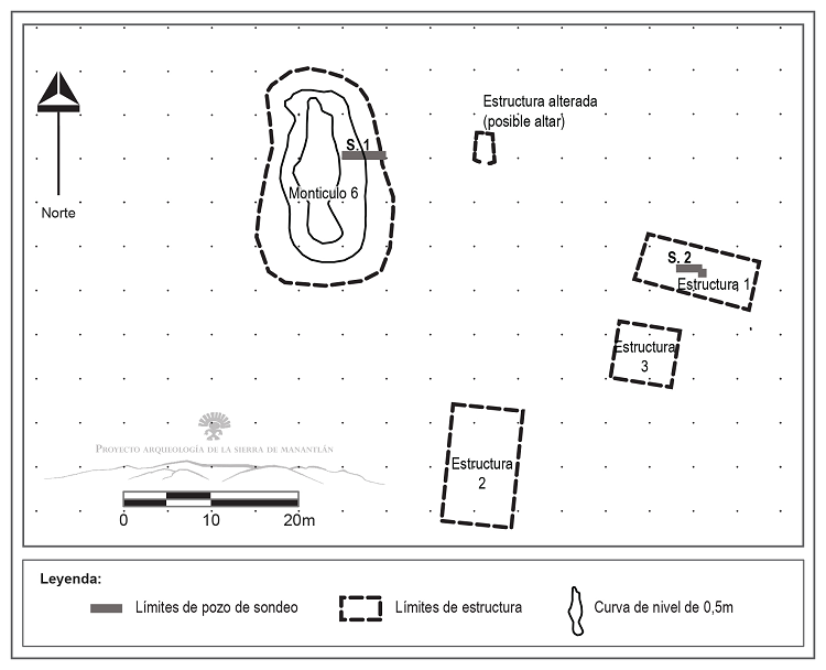 La zona del levantamiento y excavación corresponde al centro del sector 3-2, en la pequeña planicie que conforma la parcela (Figuras 3 y 4). El área comprende el montículo 6, así como tres estructuras rectangulares numeradas 1, 2 y 3, visibles por alineamientos de piedras que conforman sus cimientos (Figura 5). Además, se localizó una pequeña estructura caracterizada por una acumulación de piedras, a 10 m al este del montículo, la cual pudiera interpretarse como un altar, aunque en realidad no hay certeza sobre la función original de esta construcción. El sondeo 1 tiene forma de una trinchera que mide 1 m de ancho por 5 m de largo, orientada este-oeste, y ubicada entre la base y la cima del pendiente oriental del montículo principal del área, registrado como “montículo 6”. El sondeo 2 también es una trinchera de 1 m de ancho por 3.5m de largo, orientada este-oeste en el centro de una estructura ubicada a 30 m hacia el este, registrada como “estructura 1” (Figura 3). El objetivo de la excavación del sondeo 1 era obtener primeros datos sobre el sistema constructivo de un montículo característico de las edificaciones arquitectónicas más importantes del valle. A su vez, el principal objetivo de la excavación del sondeo 2 era obtener una secuencia estratigráfica y una muestra de artefactos que permitieran caracterizar la cultura material local. La trinchera realizada en el montículo 6 reveló la presencia de cuatro bases de muros paralelos, identificados por alineamientos sencillos de piedras, cuyos cimientos tienen distintas alturas, que correspondían probablemente a un sistema de escalones. Sin embargo, los datos obtenidos para el montículo 6 generan más preguntas que respuestas en cuanto al sistema constructivo de la plataforma (Pomedio et al., 2019: 95-102) y se requiere de mayores excavaciones para poder llegar a presentar resultados consistentes al respecto. En cambio, gracias al hallazgo de un fragmento de piso quemado, los datos obtenidos en la estructura 1 aportan elementos relevantes en cuanto a la problemática cronológica del PASM, como se detalla más adelante