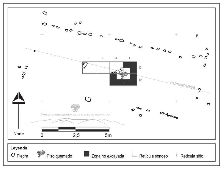 El sondeo 2 tiene una extensión original de trinchera de 3 m sobre 1 m, dividida en tres cuadros de 1x1 m (numerados J13, K13 y L13 por la retícula implementada al momento de realizar el croquis de la zona), alineados en el sentido este-oeste. Ahora bien, durante la excavación apareció en la esquina sureste del sondeo un elemento arquitectónico muy particular, identificado como piso quemado. Sin embargo, la mayor parte del elemento quedaba enterado fuera de los límites del sondeo, por lo que se tomó la decisión de ampliarlos con – de cuadro de 1x1 m cuya esquina noroeste corresponde al centro del cuadro ubicado al extremo este de la trinchera (Figura 5), y abarca una cuarta parte de los cuadros I13, I12 y J12. Así, se logró completar el registro del fragmento de piso conservado en su totalidad.