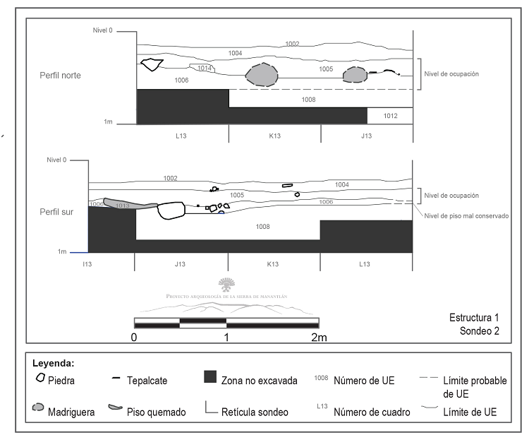 El mejor estado de conservación de las estructuras arquitectónicas del sector 3-2 motivó la excavación de dos pozos de sondeo (Figuras 3 y 4) para obtener primeros datos sobre la cultura material, las técnicas arquitectónicas y elementos de datación que permitan establecer una periodización cronológica del asentamiento. Cabe recordar que la excavación de un pozo de sondeo es una operación de exploración arqueológica que consiste en quitar el sedimento en un espacio delimitado de unos metros cuadrados (en oposición a excavaciones de áreas más extensas) para identificar y registrar las unidades estratigráficas (UE) antrópicas perceptibles en planta como en los perfiles (paredes del sondeo), así como todo elemento arquitectónico/antrópico conservado, hasta llegar al tepetate o capa geológica estéril. Todos los artefactos encontrados se recolectan para posterior análisis de laboratorio.