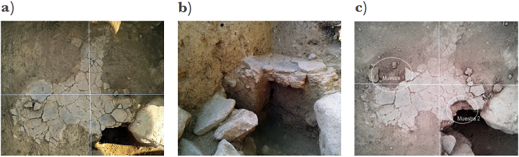 Tomando en cuenta la escasez y mala conservación del material lítico y cerámico recolectado en estos sondeos, la obtención para estudio arqueomagnético de dos muestras del piso quemado conforma hasta ahora la mejor estrategia para obtener una datación de la ocupación del sitio de La Palma. Las muestras extraídas miden aproximadamente 10x10 cm, y corresponden a fragmentos pre-delimitados por grietas, ubicados hacia los límites exteriores del piso, de manera a minimizar el impacto destructivo sobre el elemento (Figura 7c).