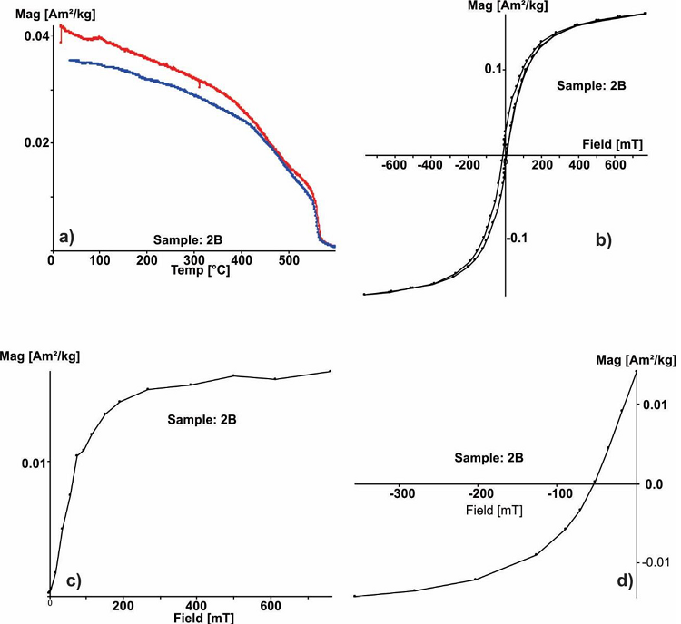 La naturaleza magnética de los minerales presentes en las muestras extraídas in situ del piso quemado fue determinada mediante una Balanza de Curie de traslación a campo variable (VFTB por sus siglas en inglés). Los experimentos se realizaron en el laboratorio del Servicio Arqueomagnético Nacional (SAN). Estos experimentos tienen la finalidad de identificar los principales portadores magnéticos, su estado de dominio y la estabilidad termomagnética. Estas mediciones incluyeron: a) curvas de adquisición progresiva de magnetización remanente isotermal (IRM por sus siglas en inglés), b) ciclos de histéresis magnética hasta 0.75 T, c) curvas de campo opuesto (también conocidos como curvas Back Field) y d) curvas termomagnéticas continuas hasta los 610 ° C. Las temperaturas de Curie de las curvas termomagnéticas se determinaron con el método de doble tangente de Grommé et al., (1969). Los parámetros de histéresis magnética como la magnetización remanente a saturación (Mrs), la magnetización a saturación (Ms) y el campo coercitivo (Hc) se obtuvieron de las curvas de histéresis después de realizar la corrección por fracción paramagnética o diamagnética. El campo coercitivo remanente (Hcr) se determinó a través de las curvas obtenidas mediante la aplicación de campos magnéticos opuestos.