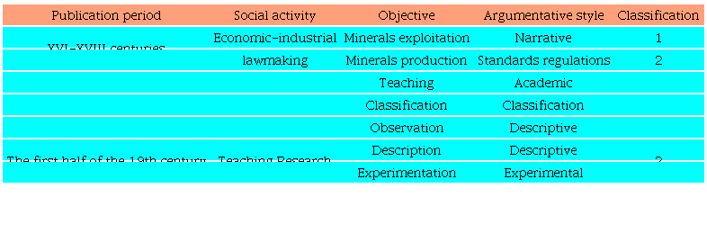 We developed a critical analysis of the set of the above documents with a model based on two matrices (Table 1)-classification of texts. According to the period of publication, social activity, the objective, and the argumentative style, as categories of analysis, the texts were classified into three categories. (i) Mineral exploitation. They are sources of practical knowledge and techniques oriented to the production of minerals, dominated by the industrial-economic sector of the XVIXVIII centuries. (ii) Teaching and classification. Texts oriented to systematize knowledge through manuals, classifications, speeches, observations, and descriptions are used in the RSM teaching programs at the beginning of the 19th century. (iii) Research. Letters to the editor to inform of some findings in mineralogy. Generally, the three types of OPIs are rhetorical components related to empirical or experimental research in the RSM laboratory during 1795-1849.