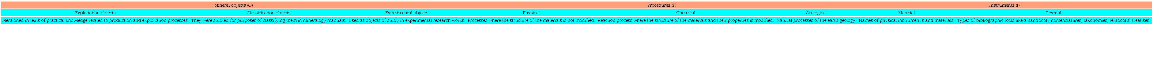 After the normalization process, we were left with 143 different minerals organized in a hierarchical ranking of taxonomies with four levels: main class, family, genus, and species. Procedures were organized in a three-class taxonomy: physical, chemical, and geological, and instruments in two classes: material (physical) and textual (bibliographic). These are structures of the necessary information on the cognitive tree of the Mexican mineralogy. We will illustrate this process in the following section.