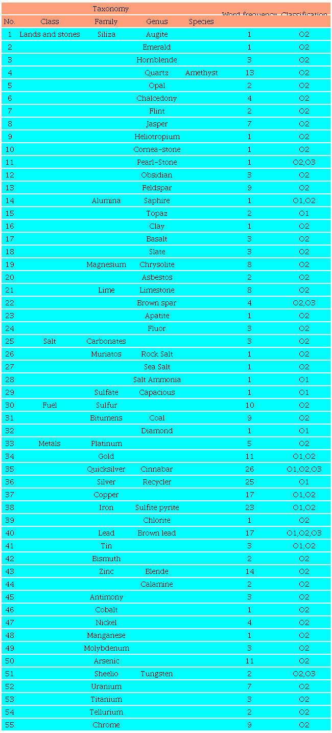 The information obtained in this way was organized in a local database. It includes the code associated with each document, the respective OPI, the social sector involved, the objective, the argumentative style, and a classification. We identified 499 names of minerals. This set includes variations of the same mineral name depending on the document’s geographical area and language. We performed a normalization process of the names according to the nomenclature of the mineralogy field described in the following sources: Orictognosia Handbook (Rio, 1795) 1 and Treaty 2 (Rio, 1832); Karsten Mineralogy Tables (Karsten, 1804); and English, German and French Dictionaries (Diccionario Visual, 2011).