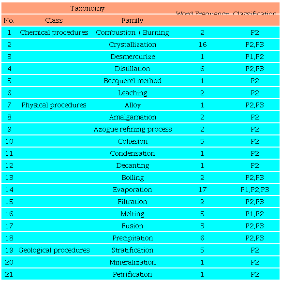 This process involves various physical and chemical procedures: grinding of minerals, the benefice of quicksilver, desazogue, evaporation, and melting. These procedures correspond to a long period with technical knowledge focused on economy-productive activity. At the end of the XIX century, a training scheme changed, and technical information (chemical, physical, geological) was included in the textbooks, as shown in Table 4. This level of teaching led to the use of scientific practices such as chemical and physical methods of crystallization, evaporation, filtering, fusion, and precipitation. However, the amalgamation method may be considered the starting point in developing new methodologies of the scientific text in mineralogy.