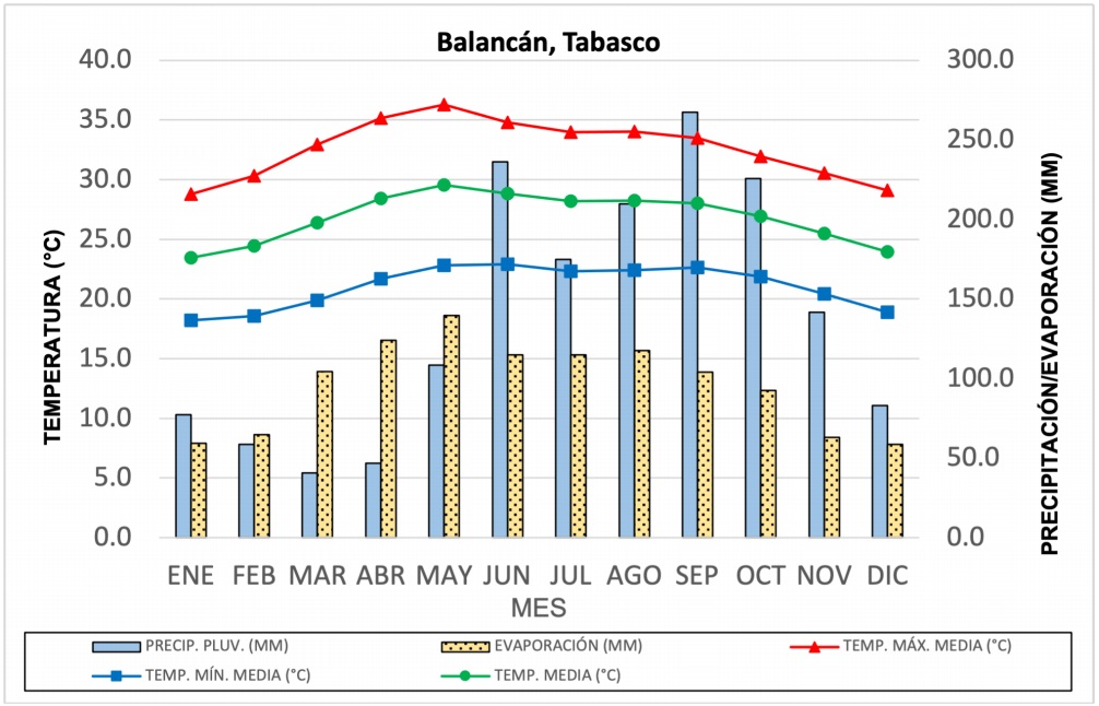 La Figura 2 muestra un climograma representativo de Balancán, obtenido de un análisis estadístico realizado a los parámetros registrados en estaciones climáticas de la zona de estudio, el cual corrobora que este municipio cumple con el patrón estatal de lluvias y temperatura.