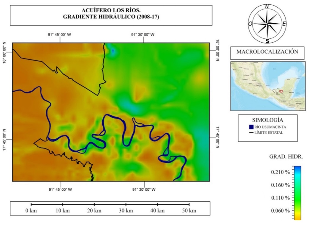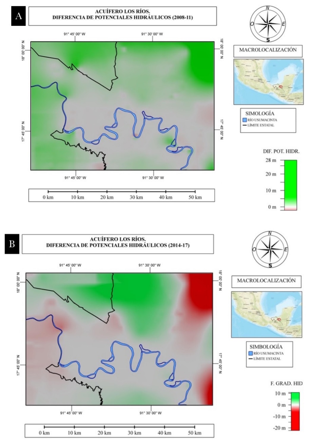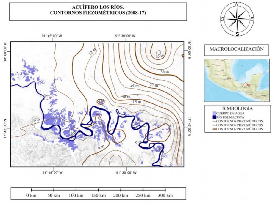 Se contrastaron las diferencias entre los contornos de curvas equipotenciales para diferentes periodos de tiempo que, al analizar los mapas, ponen de manifiesto una reducción paulatina del nivel freático. En particular, esto puede observarse en el extremo noreste de la zona de estudio hasta aproximarse a las márgenes del Río Usumacinta, principal cauce de la zona, lo cual sugiere que el acuífero aporta agua al sistema superficial suprayacente (Figura 6).