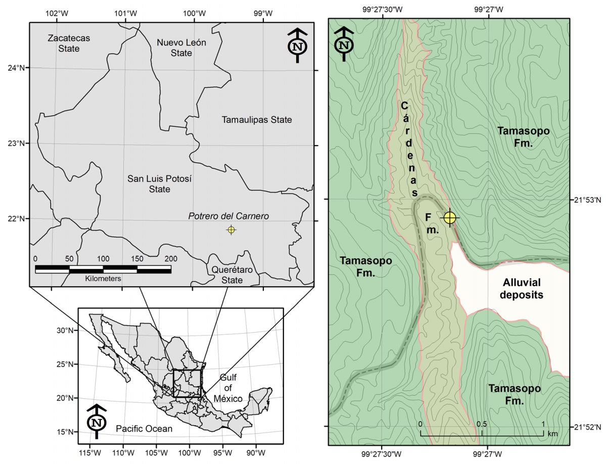 The study area is located in the Valles-San Luis Potosí Platform (VSLPP), a Mesozoic paleogeographic positive element where diverse evaporitic and marine Jurassic units, as well as shallow and reef Cretaceous carbonates, were deposited (Carrillo-Bravo, 1971). All these units underlay sandy and argillaceous with calcareous influence sediments (Carrillo-Bravo, 1971; Maldonado-Sarabia and Ríos-Vázquez, 2020). At Potrero del Carnero, Rayón municipality, southwestern San Luis Potosí State, the Cárdenas Formation conformably overlies the Tamasopo Formation (Figure 1; 21°52’18.84 N, 99°26’49.19 W).