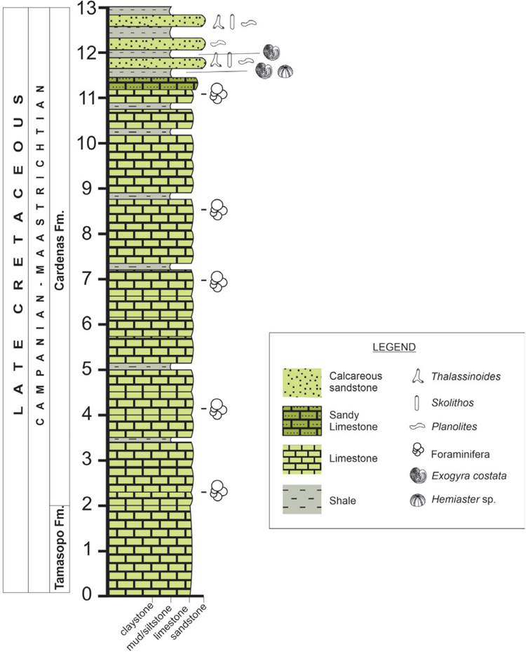The Cárdenas Formation has been studied for more than 100 years and several studies have demonstrated its paleontological significance documenting ammonites (Ifrimet al., 2005), brachiopods (Myers, 1968; Pérez-Martínez, 2010), corals (Navarro-Moctezuma, 2004; Baron-Szaboet al., 2006), crustaceans (Vegaet al., 1995), echinoderms (Myers, 1968; Navarro-Moctezuma, 2004; Marín-Ávila, 2012), bivalves, gastropods (Böse, 1906), ostracods (Causet al., 2002), rudists (Böse, 1906; Schafhauseret al., 2007; Oviedo-García, 2005; Ponset al., 2013), and foraminifers (Barker and Grimsdale, 1937; Carrillo-Bravo, 1971; Aguilaret al., 2002; Causet al., 2002; Omañaet al., 2008, 2012, 2013). Its ichnological record includes traces ofOphiomorpha nodosa,Skolithos linearis,Diplocraterion parallelum, andPalaeophycus tubularis(Palma-Ramírezet al., 2019).