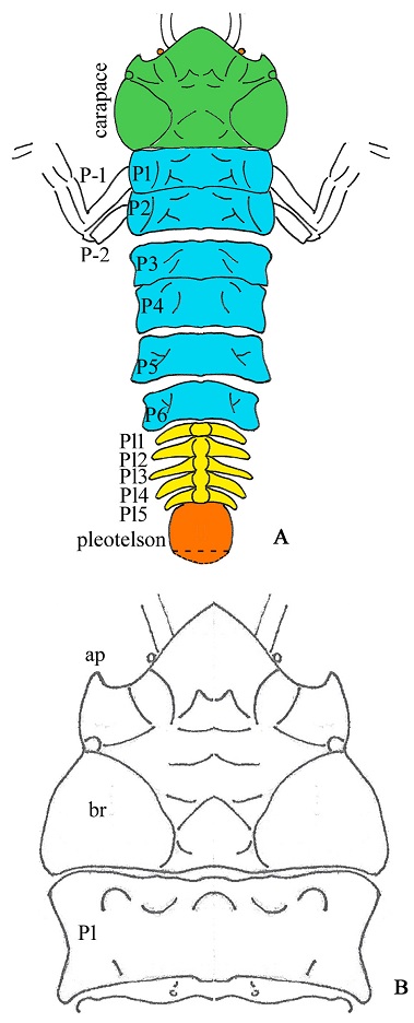 Carapace- Sub-pentagonal carapace with rounded lateral margins, wider than long; cephalic region with moderately elongate sub-triangular rostrum with wide base, terminating in an obtuse pointed tip slightly downward directed with a distal median slight longitudinal groove; rostral lateral margins slightly convex; small, rounded eyes, eye-lobes apparently not present; short anterolateral pointed triangular process frontally directed; rounded branchial regions (corresponding to the fused thoracic somites 1-2) vaulted dorsally and flattened ventrally, wider than the cephalic region; convex lateral margins of branchial regions, tapering to the anterolateral pointed process/spine; almost straight carapace posterior margin slightly sinuous; fusion of cephalon and vestigial thoracic somite1-2, indicated by pair of lateral notches, connected by a transverse concave suture; posterior half of carapace wider than pereon.