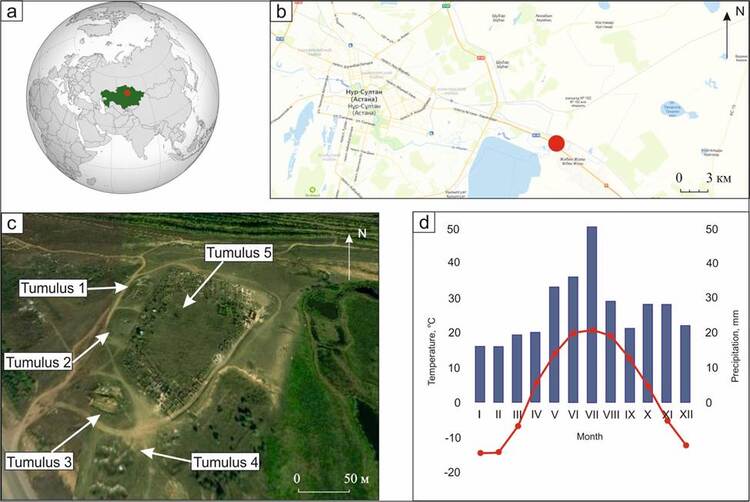 The burial ground is located on the high right bank of the Ishim River in Nur-Sultan, Kazakhstan (51° 6’12.44” N, 71°43’9.50” E) (Figures 1a, 1b and 1c). The ancient tribes favoured the site because of the picturesque surrounding landscape. The elevated position of the terrace provides a good view of the vast river valley. Below there a wide floodplain extends with numerous oxbows and meandering branches of the riverbed. Five large tumuli 12-45 m in diameter and 1-3 m high were built within the burial ground (Figure 1c). Тumuli form a north-west to south-east oriented chain along the edge of the terrace (Sviridov, 2006; Khabdulina, 2019; Tleugabulov and Gaisa, 2020). The investigation of the tumuli in the Koy-Gunzhar tsar burial ground revealed several construction techniques. The tumulus 1 mound is of utmost interest as its embankment is composed of heterogeneous patchy material which is not local. A paleosol buried under the embankment has an iron and manganese-enriched horizon. Similar horizons are absent in the surface soils as well as in paleosols buried under other tumuli of the Koy-Gunzhar burial ground.