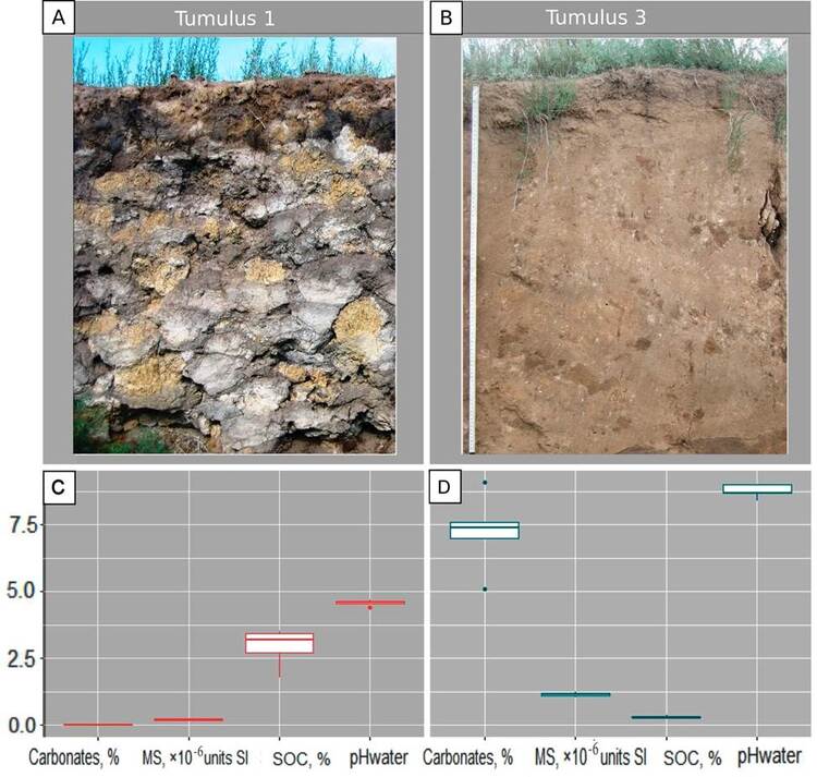 Geoarchaeological studies of tumuli often involve buried soils, which are commonly used to reconstruct the paleo climate dynamics (Sverchkova et al., 2020; Khokhlova and Kuptsova, 2019; Makeev et al., 2021).