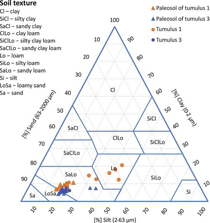 Tumulus 3 had a low mean value of soil organic carbon content (less than 0.3%), alkaline reaction, as well rather high carbonate contents and magnetic susceptibility (exceeding 1) (Figure 3d). It has loamy sand and a sandy loam texture (Figure 4).