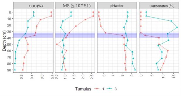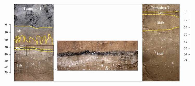 Paleosols buried under the tumuli 1 and 3 have some common features (especially in the lower part of the profiles) but those diverge considerably from each other both in morphology and analytical features in their upper part.