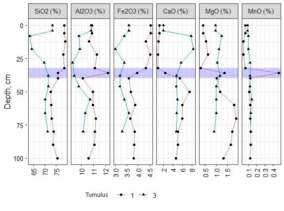 The total content of chemical elements in the paleosol under the tumulus 1 revealed redistribution of elements related both to key soil-forming processes of buried soil (accumulation and redistribution of carbonates) and presumably to specific diagenetic processes. The profile was differentiated into two parts: the upper 0-32 cm and the lower 32-100 cm. The upper part recorded leaching of Ca and Mg along with an accumulation of Fe. In the 0-32 cm layer content of CaO was 1%, increasing downwards in the Bkb horizon up to 4-6%. Magnesium was accumulated at the depth of 50-80 cm, reaching 1.6-1.8%. The Bw2b horizon at the 32-36 depth revealed a sharp increase in contents of Аl2O3 and MnO.