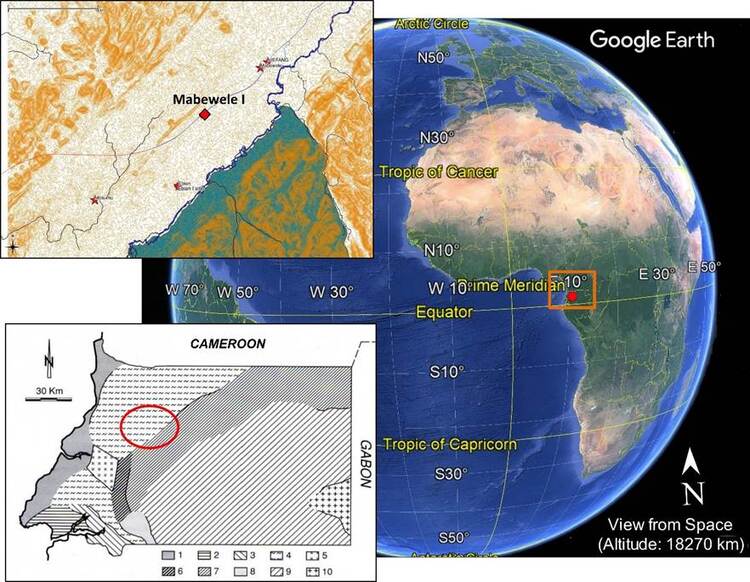 “Mabewele I” archaeological site, was located in 2016 and excavated in 2017 and 2019. There geographic coordinates are N 1°18’10.7” and E 10° 10’30.10”, at 325 m above sea level (a.s.l.). The site is 4 km southwest of Niefang, close to the Bata-Niefang highway, which extends over a plain formed on an alluvial terrace. The area belongs to Mabewele County and is in the Uoro Depression Physiographic Region (IUCN, 1991).