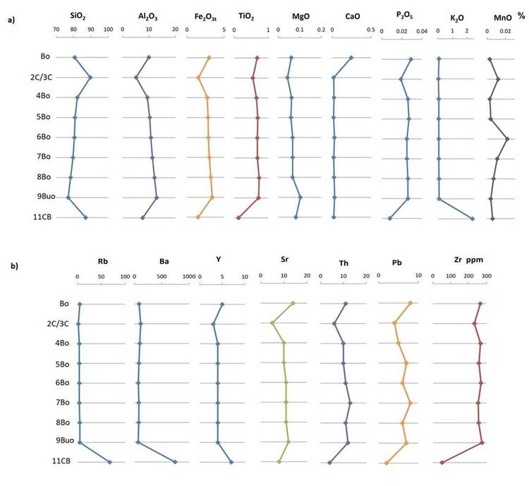 Trace elements (Figure 10b) showed clear differences between saprolite and soil material. The most evident change was observed in the content of Rb, Ba and Y, with maximum values in 11CB (saprolite) and a drastic decrease in the other horizons, while the content of Sr, Th, Pb, or Zr, showed the opposite trend, with minimum contents at 11CB and an increase in the Bo horizons.