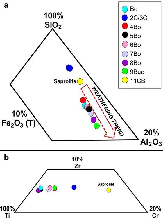 7. Ternary plot of the three main oxides (SiO2-Al2O3-Fe2O3) was calculated to know the general weathering trend, according to Hill et al.(2000). Additionally, to evaluate the affinity with the parent material and detect lithological discontinuities within the studied sequence, the ternary plot Zr-Cr-Ti was considered, modified from Mounteney et al. (2018).
