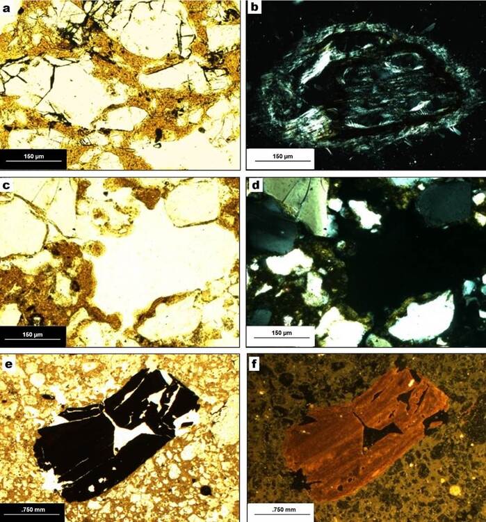 Micromorphological analysis showed that, in general, the groundmass throughout the sequence is composed of coarse to fine sand, with a predominance of quartz and quartzite lithic fragments, and some micas (muscovite) in an iron-clay fine material. The coarse particles are angular and irregular and have different degrees of weathering (Figures 12a-12f). Weathered muscovite grains still retaining their laminar structure were observed (Figures 13a and 13b). Evidence of recent biological activity was also observed throughout the profile, such as root growth and fresh plant material, even in the deep horizons (Figure 12b).