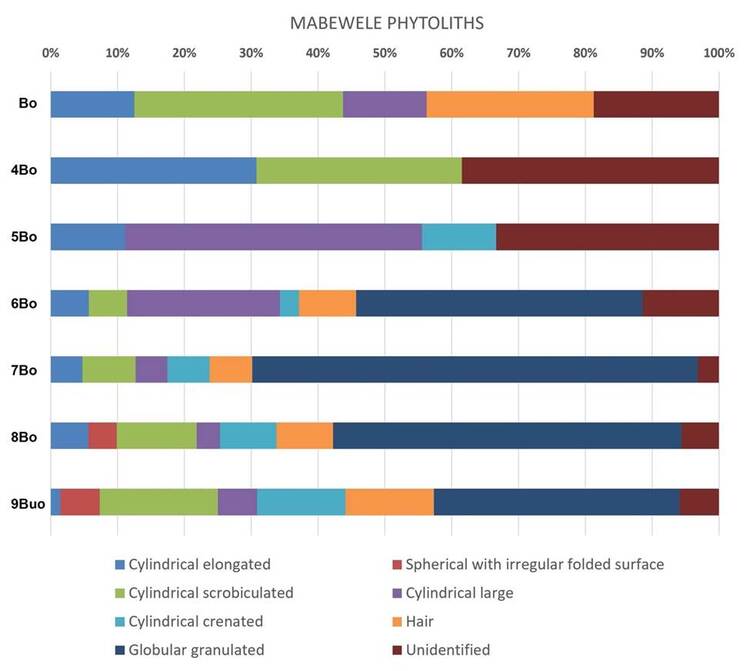 Phytoliths were recovered from seven horizons along the sequence from top to bottom (Bo to 9Buo). Eight different groups were morphologically separated: cylindrical, cylindrical scrobiculate, cylindrical crenate, cylindrical elongated, globular granular, spherical faceted, spherical with irregular folded surface and not identified (Figure 14).