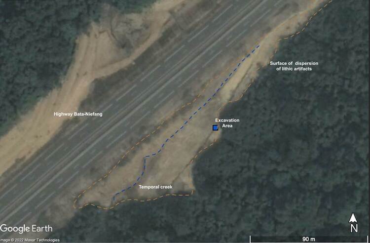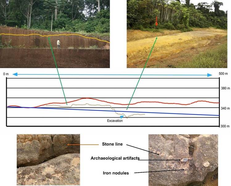 The surface survey revealed that during the construction of the Bata-Niefang highway, a 20-meter embankment was cleared on each side of the road, revealing numerous stone artifacts (Figure 2).