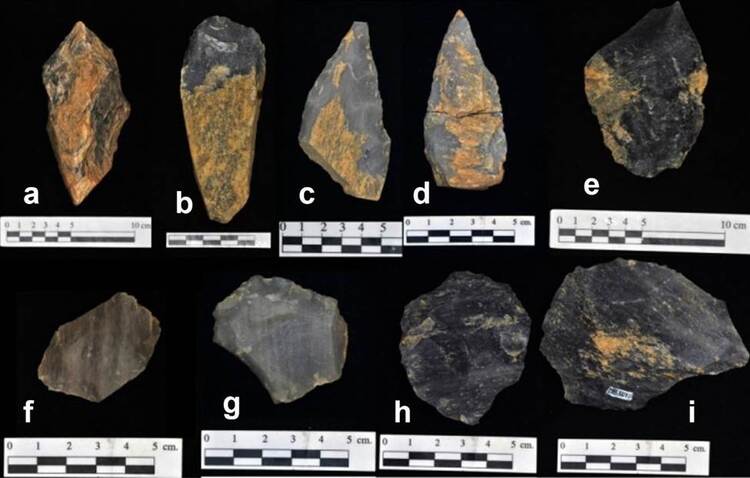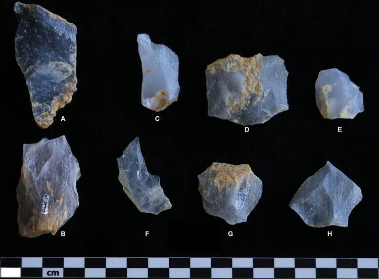 Although some scattered quartzite chips were recorded in all horizons, most flakes and chips were concentrated in the horizon 9Buo and in the area of contact with 10Bco. This horizon (10Bco) is a conglomerate of iron oxide nodules that make up the “stone line” (Mercader et al., 2002) and flakes and chips inside come from 9Buo due to vertical displacement. Therefore, 9Buo is the only archaeological level of the excavation. In this layer, a levalloisflake fractured in half, several irregular centripetal extraction flakes, unifacial and bifacially retouched flakes and numerous non-diagnostic flakes and chips, made on polyhedral and levallois cores and flat tablet cores (Figure 4) were recorded. The raw material is like some surface materials (preliminary identified as quartzite).During the excavation, some lithic artifacts were found in small concentrations, with “fresh” edges that show no erosion or wear by natural processes.