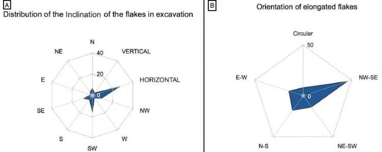 There are even some sets of flakes that can be rejoined (Figure 5). In addition, the inclination and orientation of each flake were registered, to evaluate the degree of alteration and movement of the lithic artifacts inside the sediment (Figure 6). In this way, the analysis of the spatial distribution showed that most of them present a preferential orientation of their major axes, which indicates that they were deposited by a flow of materials. However, most of the pieces are in a horizontal position, which suggests, along with the erosion-free condition of the edges, that the displacement was very short, and the artifacts are not far from where they were originally abandoned.
